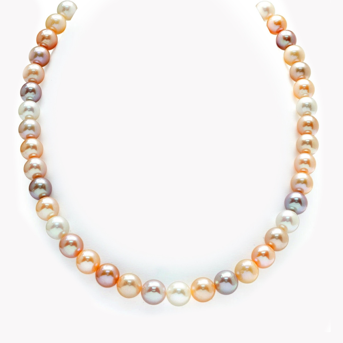 17.5 Inch Multicolor South Sea & Freshwater Pearl Necklace featuring 31 Peach, Pink, Golden, Black, and White Pearls measuring 13.1-15.1mm Strung onto a 14kt Yellow Gold Ball Clasp with 13 H/SI Quality Round Brilliant Cut Diamonds weighing a total of 0.13cts