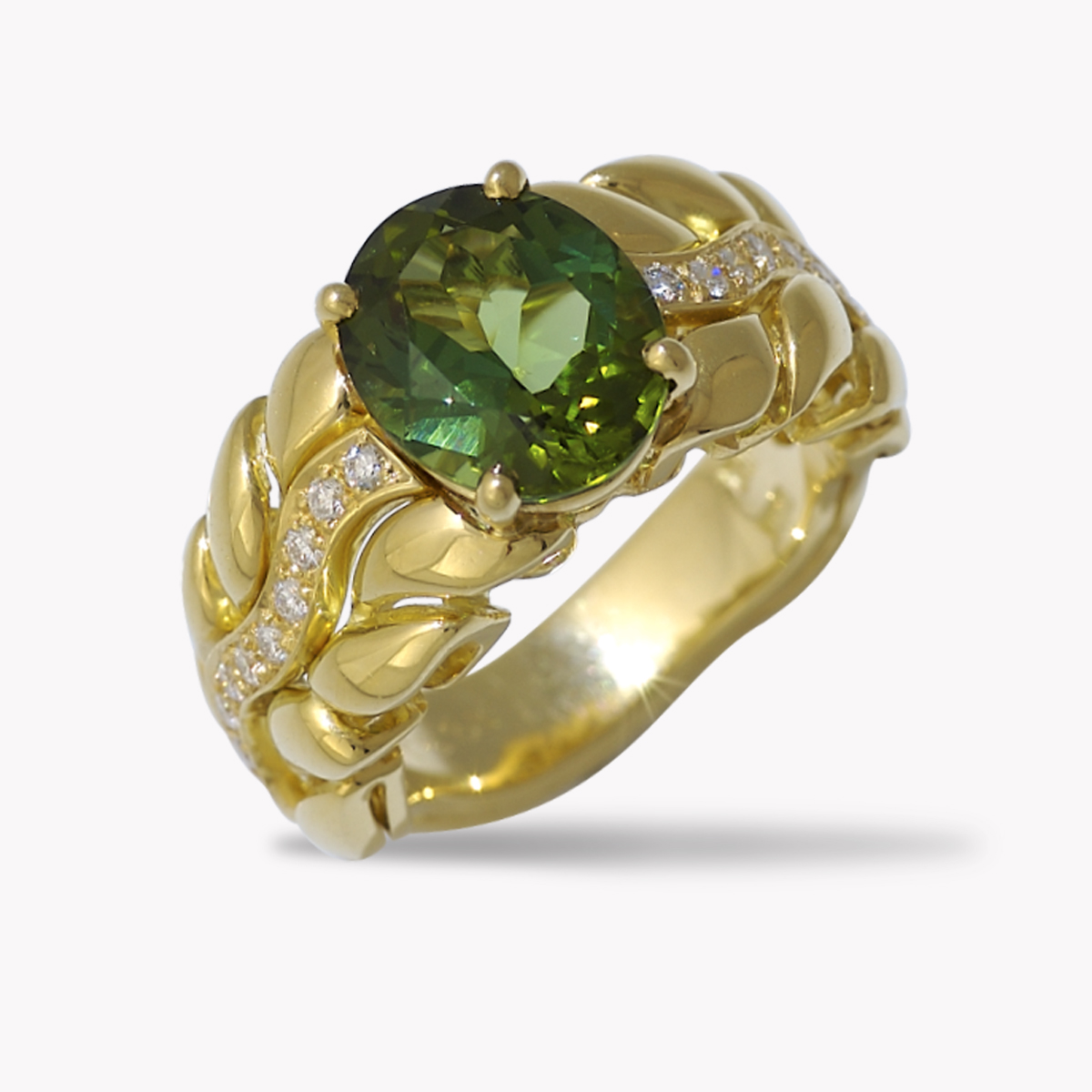 Double Flowing Lines Green Tourmaline Ring in Yellow Gold