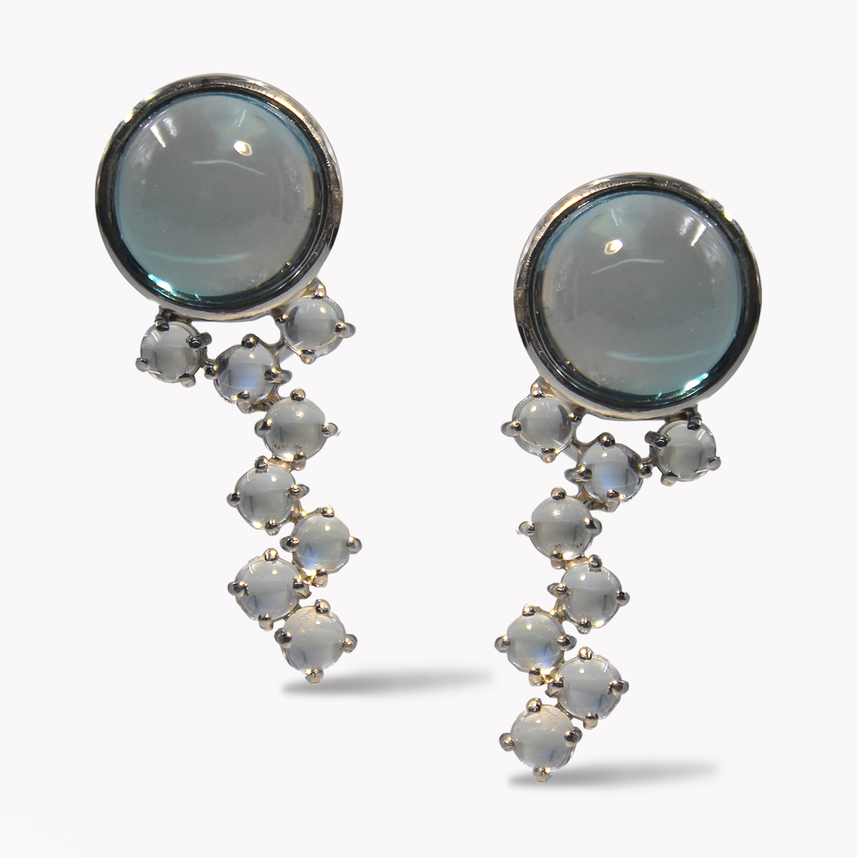 Blue Topaz Cabochon & Moonstone Drop Clip Earrings Designed & Handmade by Kaufmann de Suisse in 18kt White Gold featuring 2 Cabochon Cut Round Blue Topaz weighing a total of 20.83cts and 16 Round Cabochon cut Moonstones weighing a total of 3.56cts