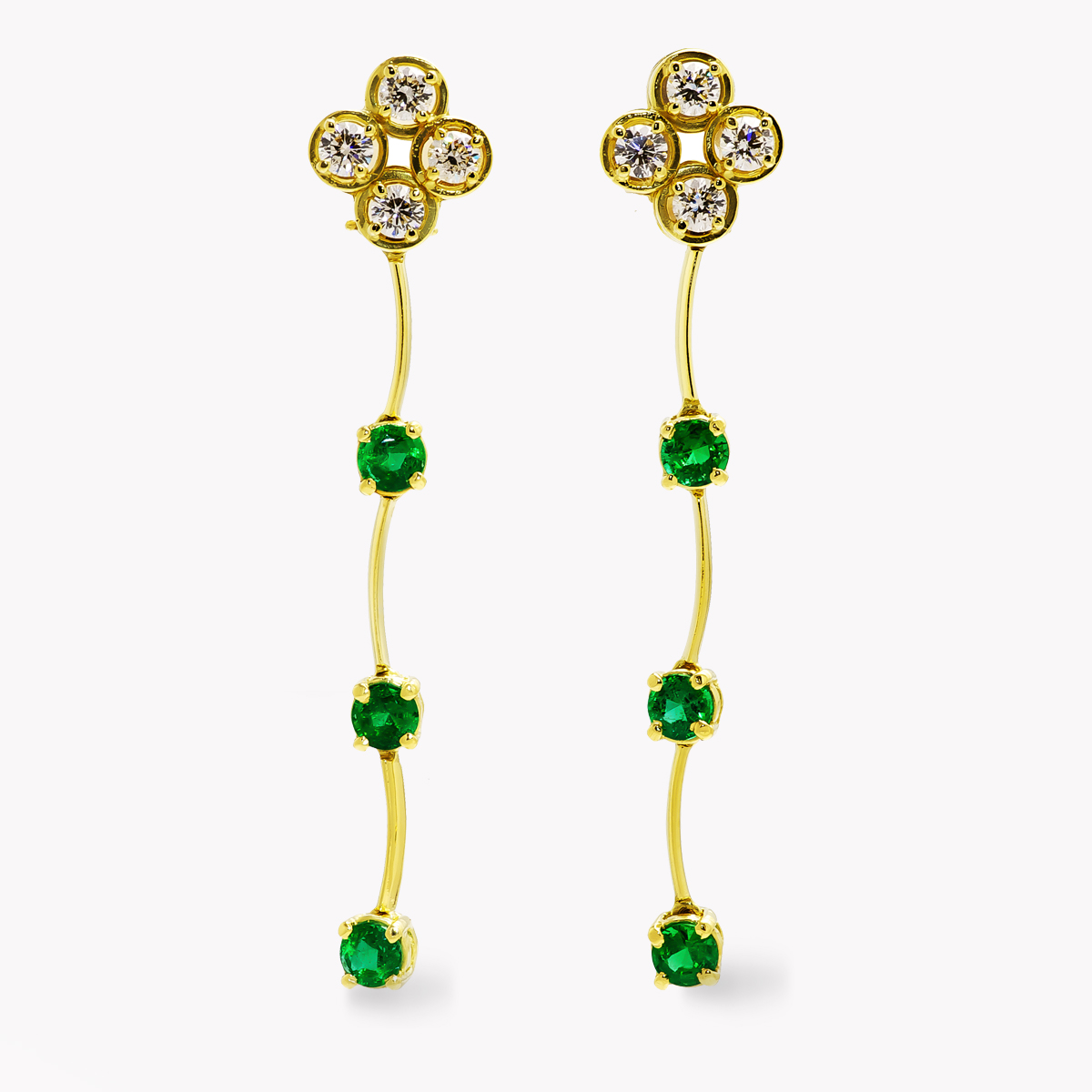 Cascade Dangle Drop Earrings Designed & Handmade by Kaufmann de Suisse in 18kt Yellow Gold featuring 8 Round Brilliant Cut G/SI Quality Diamonds weighing a total of 1.89cts and 6 Round Emeralds weighing a total of 2.72cts