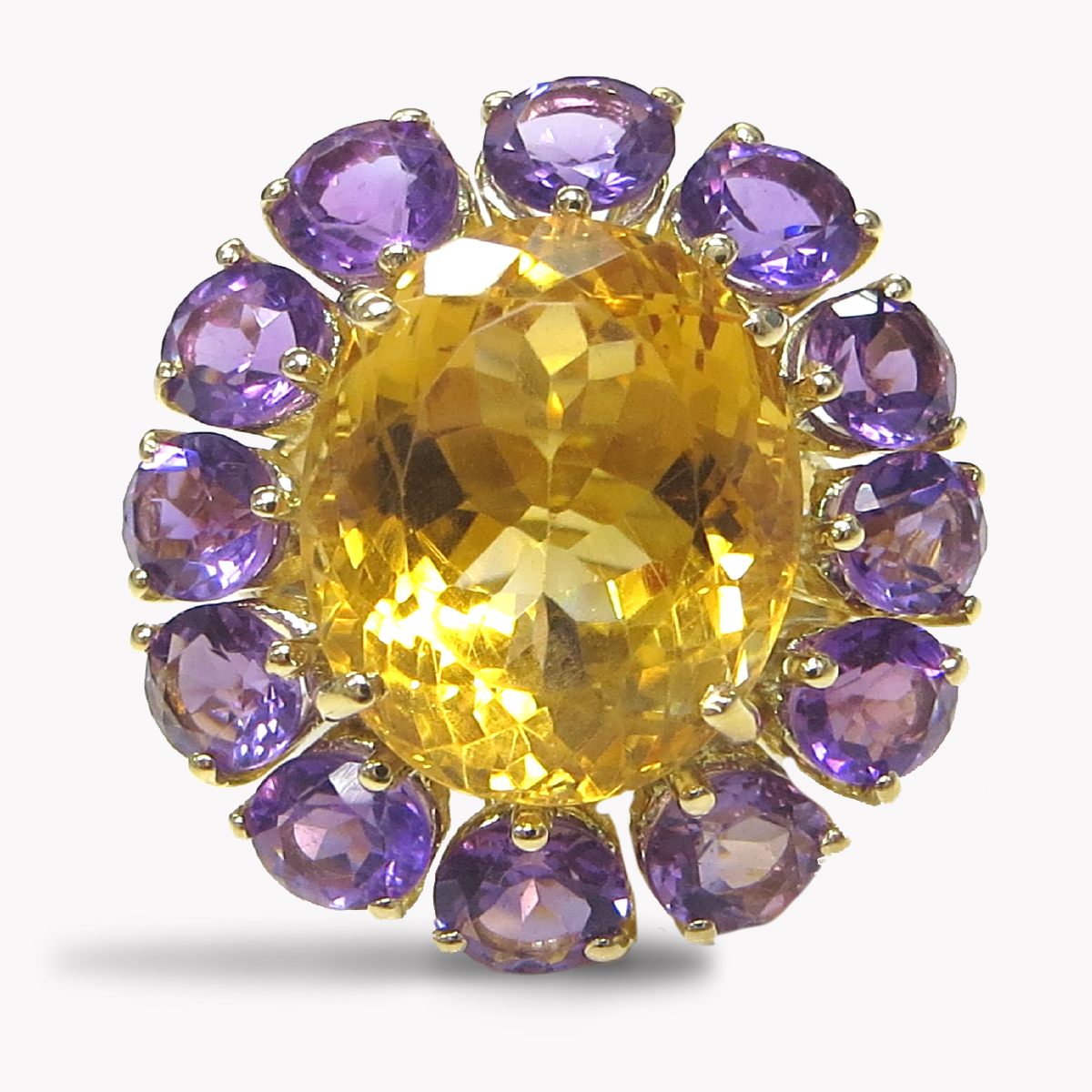 Citrine and Amethyst Flower Ring Designed & Handmade by Kaufmann de Suisse in 18kt Yellow Gold featuring 1 Oval Citrine weighing 12.83cts surrounded by 12 Round Amethysts weighing a total of 5.50cts