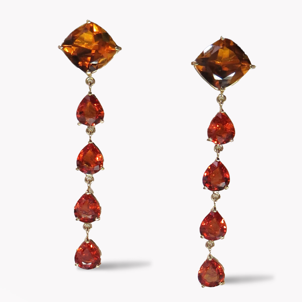 Citrine & Orange Sapphire Dangle Drop Earrings Designed & Handmade by Kaufmann de Suisse in 18kt Yellow Gold featuring 2 Cushion Cut Citrines weighing a total of 7.69cts and 8 Pear Shape Orange Sapphires weighing a total of 10.59cts