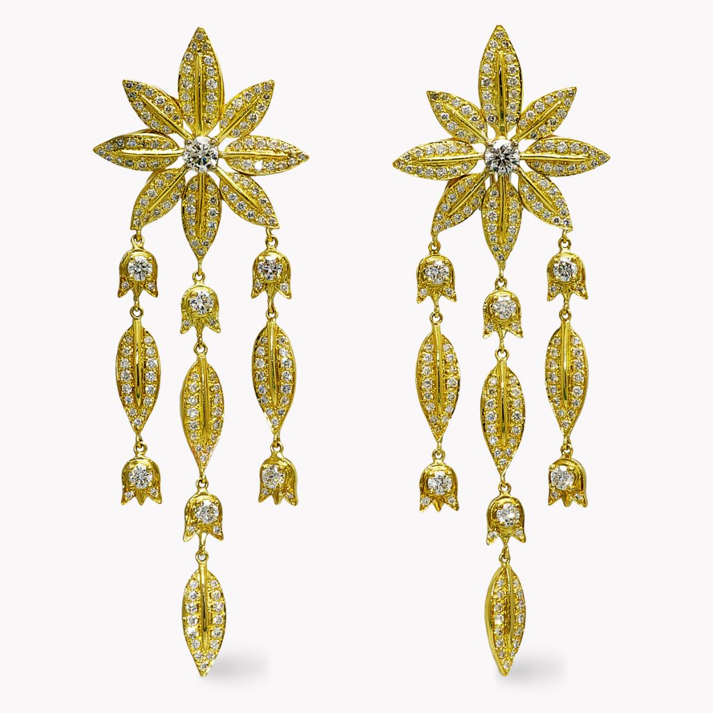 Lilly of the Valley Coral & Diamond Dangle Drop Earrings Designed & Handmade by Kaufmann de Suisse in 18kt White Gold featuring 2 x 8.5mm Coral Beads and 48 Round Brilliant Cut G/Si Quality Diamonds weighing a total of 3.03cts