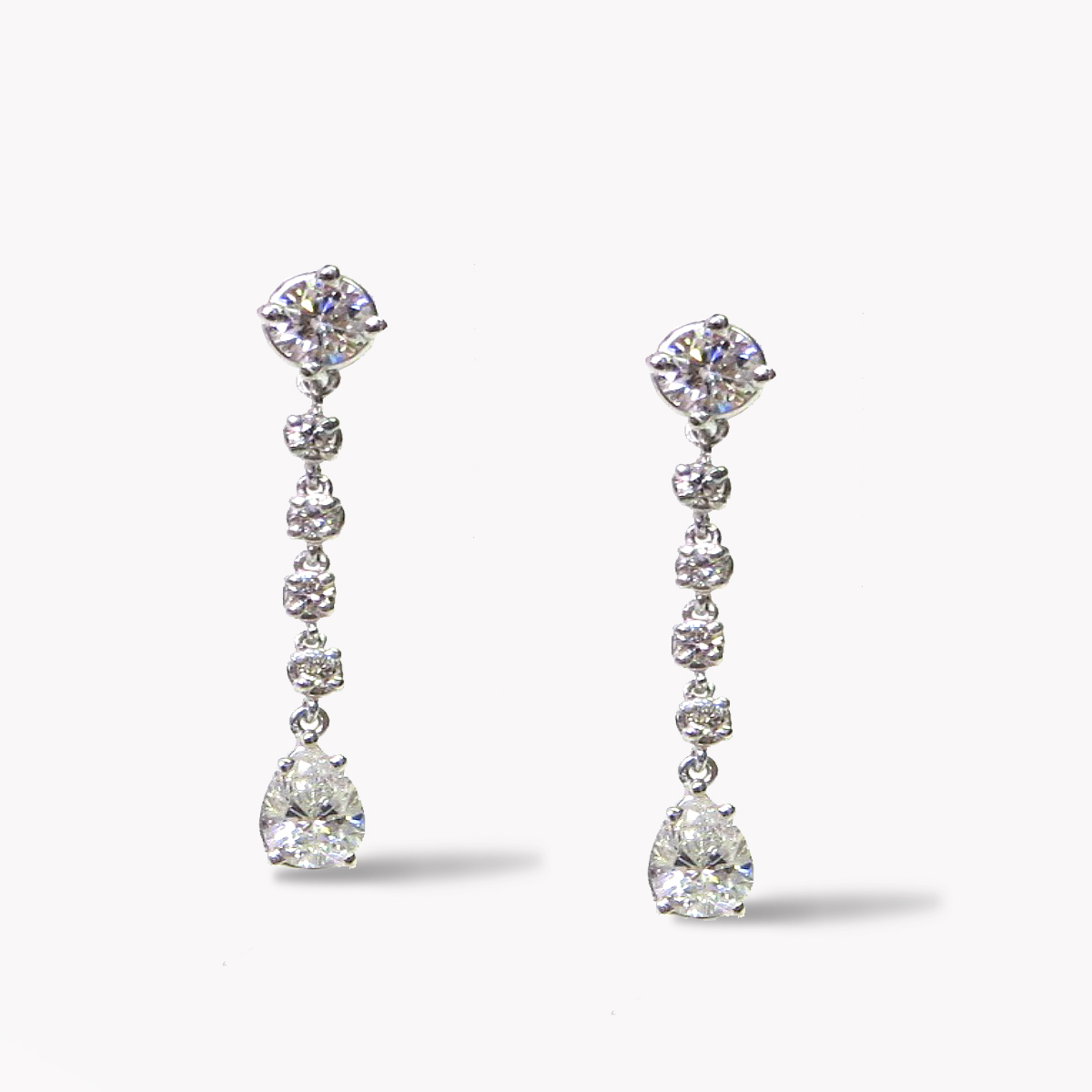 Diamond Dangle Drop Earrings Designed & Handmade by Kaufmann de Suisse in 18kt White Gold featuring 2 Pear Shape G/SI1 Quality Diamonds weighing a total of 1.02cts and 10 Round Brilliant Cut F/VVS Quality Diamonds weighing a total of 0.86cts