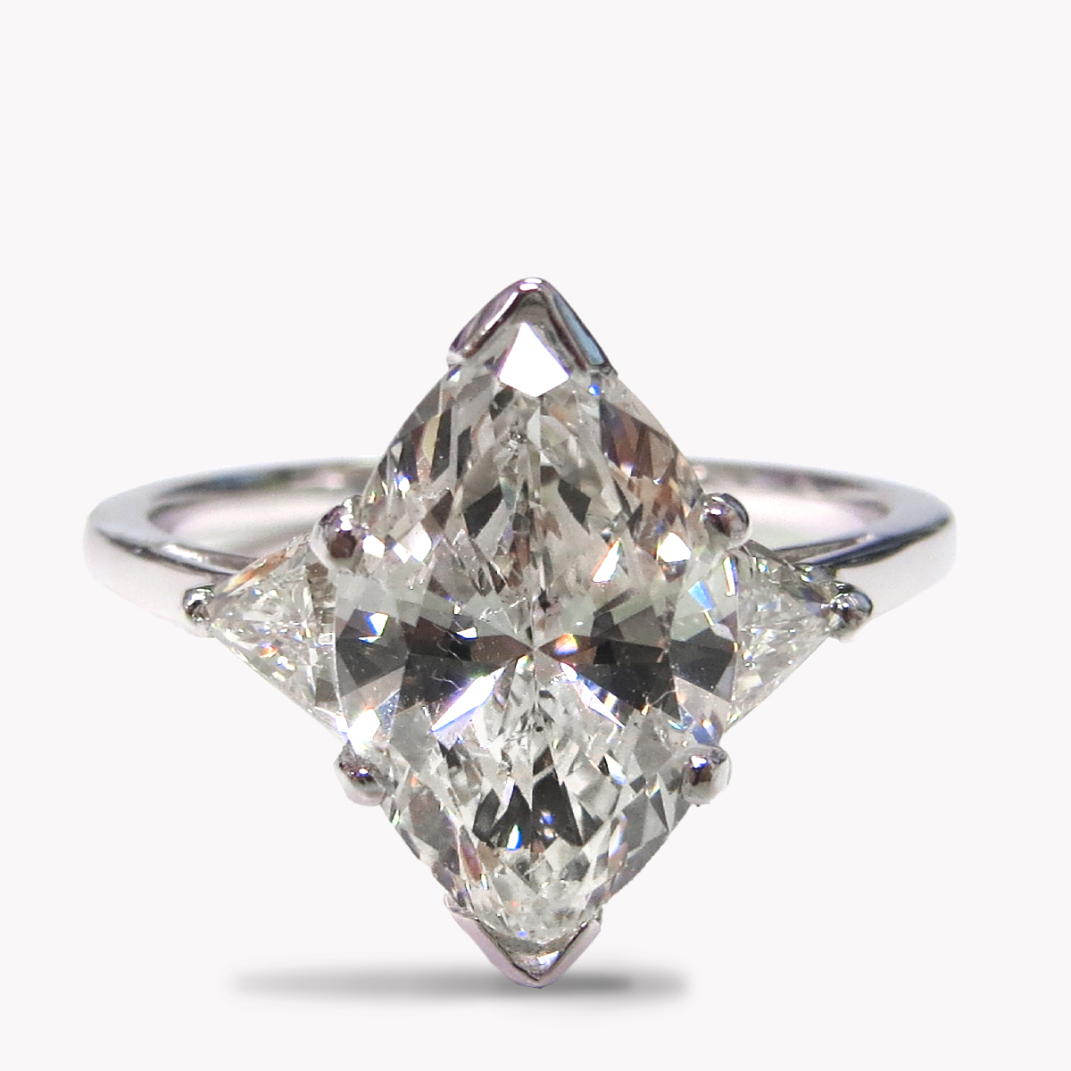 Diamond Marquise Triple Row Ring Designed and Handmade in 14kt White Gold & Platinum featuring 2.42cts L/SI2 Quality Diamonds flanked by 2 Triangle L/VS Diamonds weighing a total of 0.62cts and mounted with 23 Round Brilliant cut I/SI Quality Diamonds weighing a total of 0.69cts