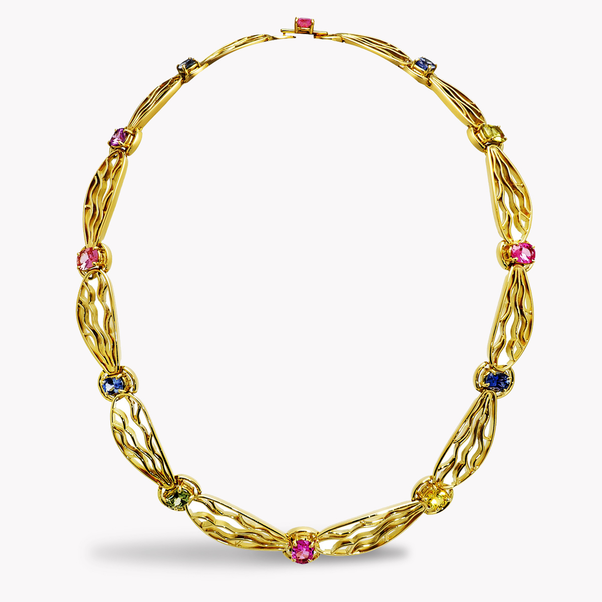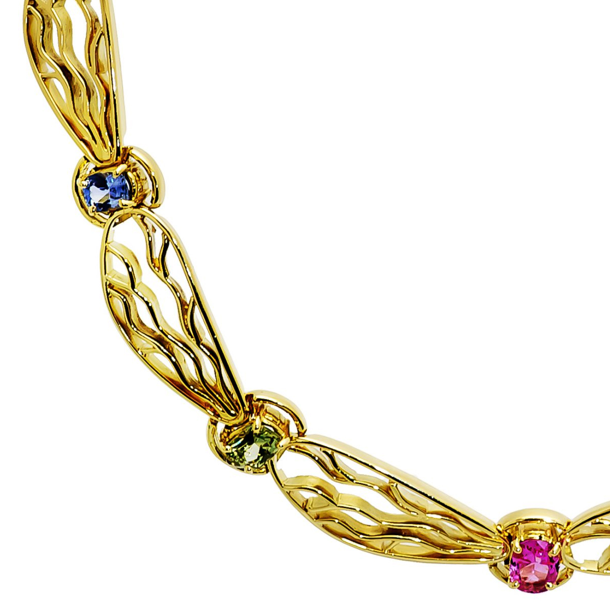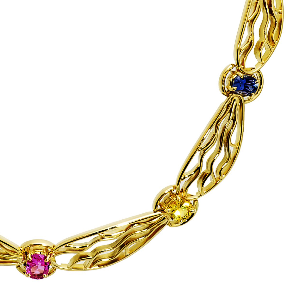 Dragonfly Necklace Designed & Handmade by Kaufmann de Suisse in 18kt Yellow Gold featuring 12 Multi-Color Oval Sapphires weighing a total of 12.88cts