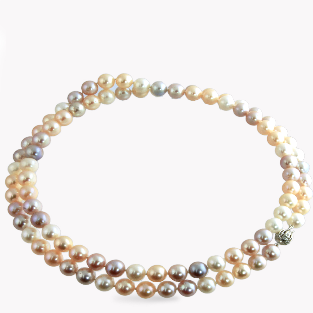 34 Inch Freshwater Pearl Strand Necklace Designed and Handmade by Kaufmann de Suisse featuring 89 Peach, Pink and White Freshwater Pearls measuring 8.5 to 9.7mm strung with a 14kt White Gold Ball Clasp featuring 12 Round Brilliant Cut G/SI Quality Diamonds weighing a total of 0.06cts