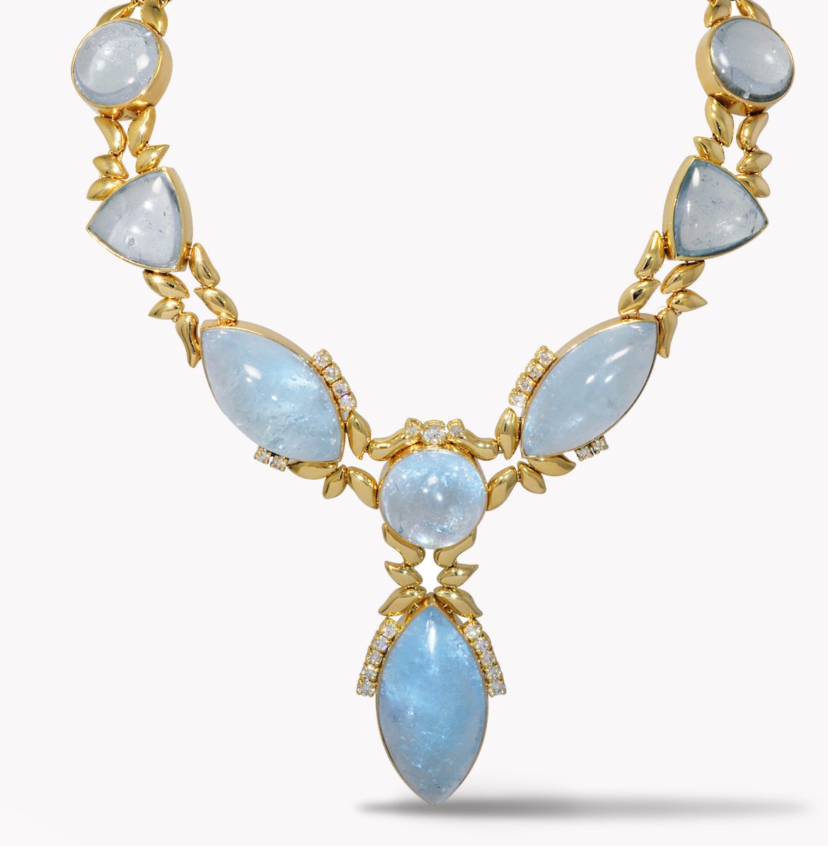 One of a Kind Opal, Diamond & Yellow Gold Drop Necklace Designed & Handmade by Kaufmann de Suisse in 18kt Yellow Gold featuring 14 Muzo Mine Multi-Color Opals weighing a total of 130.35cts and 12 Round Brilliant Cut G/VS Quality Diamonds weighing a total of 1.80cts, 4 inch drop