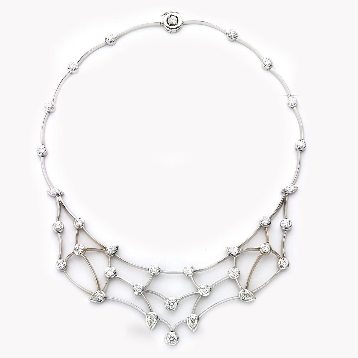 Planetary Diamond Constellation Necklace Designed & Handmade by Kaufmann de Suisse in 18kt White Gold featuring 31 Round, Marquise and Pear Shaped E-H Color, VS to SI Quality Diamonds weighing a total of 9.48cts