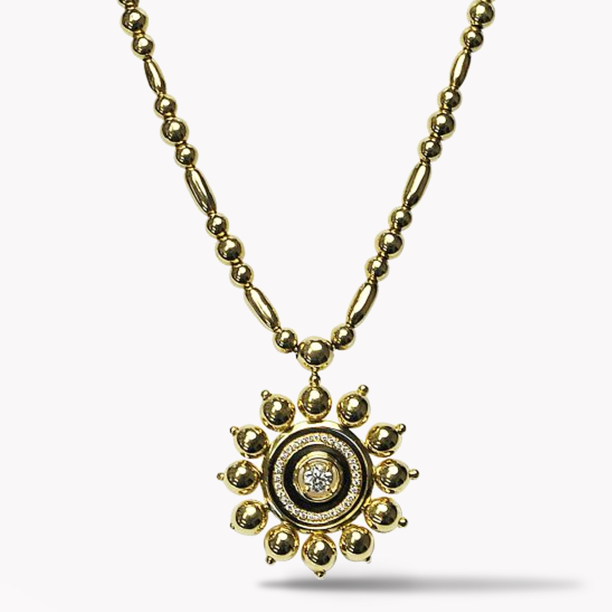 Soleil Diamond Necklace Designed & Handmade by Kaufmann de Suisse in 18kt Yellow Gold featuring 3 Round Brilliant Cut H/SI Quality Diamonds weighing a total of 0.90cts and mounted with 76 Round Brilliant Cut H/SI Quality Diamonds weighing a total of 0.76cts